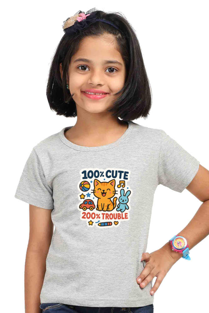 100% Cute 200% Trouble – Girls’ Crew Neck T-Shirt | Adorable Cat Print | 100% Cotton | Bio-Washed | Soft & Comfy Tee