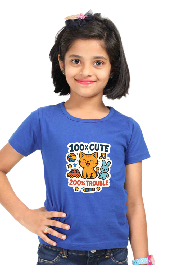 Double the cuteness, double the fun! This “100% Cute, 200% Trouble” girls’ t-shirt is made for little ones with big personalities. Featuring an adorable cat with playful prints, this tee is perfect for girls who bring joy, laughter—and just a bit of mischief—wherever they go!