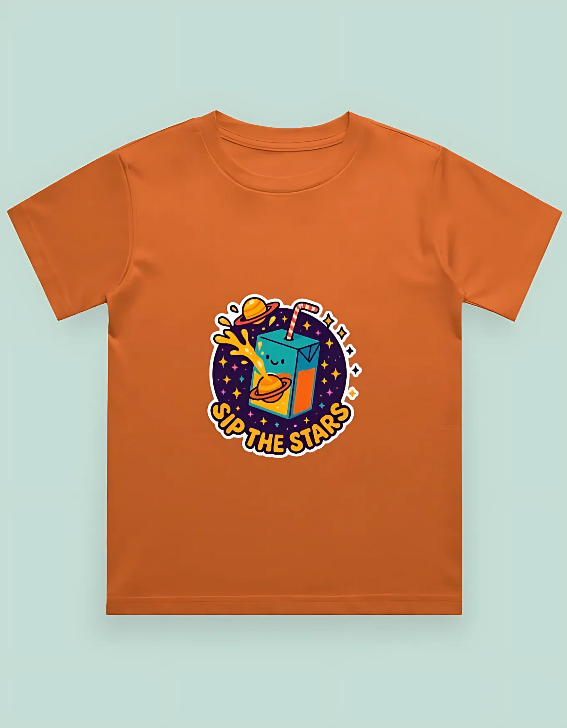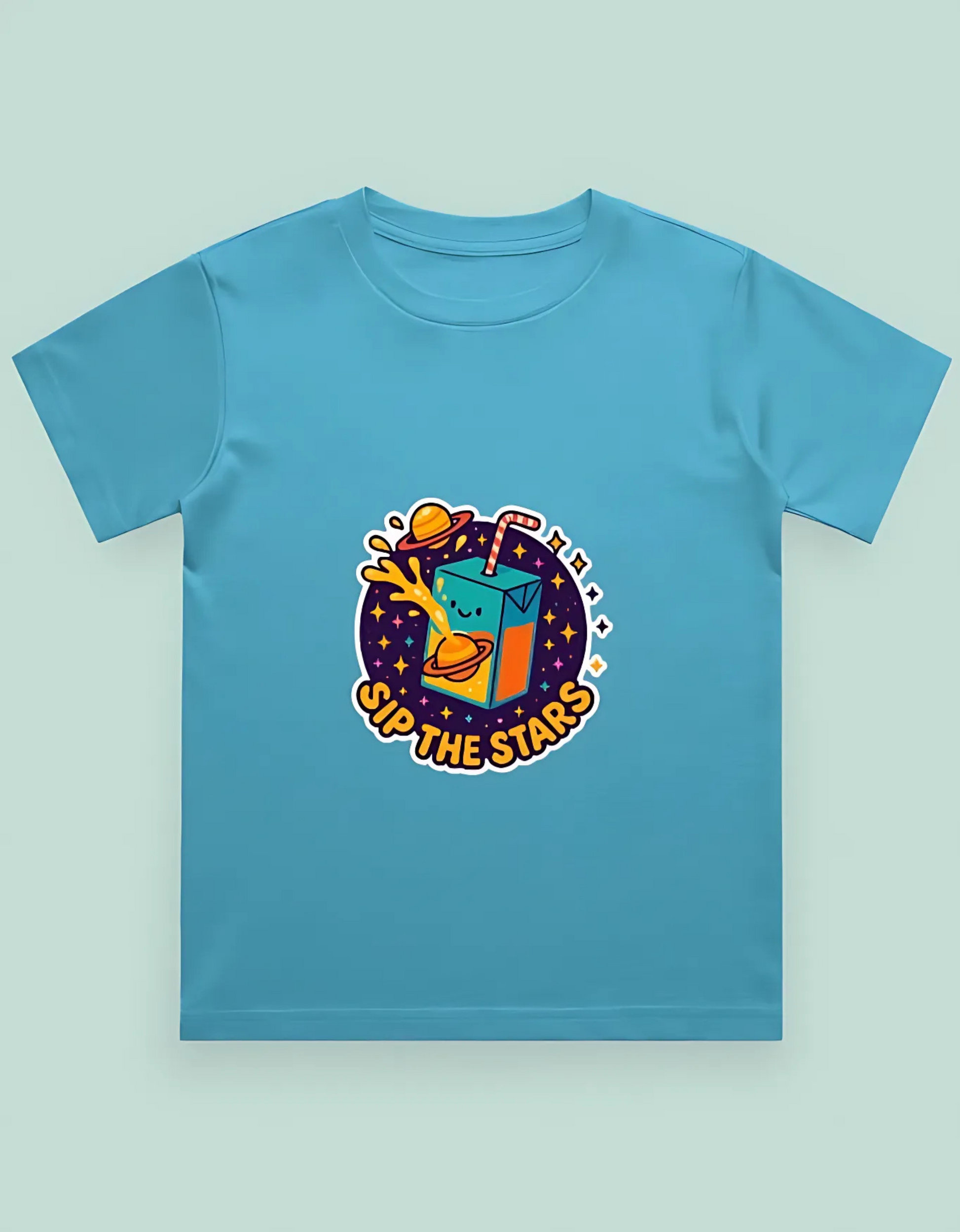 Boys’ Classic Cotton T-Shirt – “Sip the Stars” Space Juice Box Print | 180 GSM | 100% Super Combed Cotton | Fun Unisex Fit