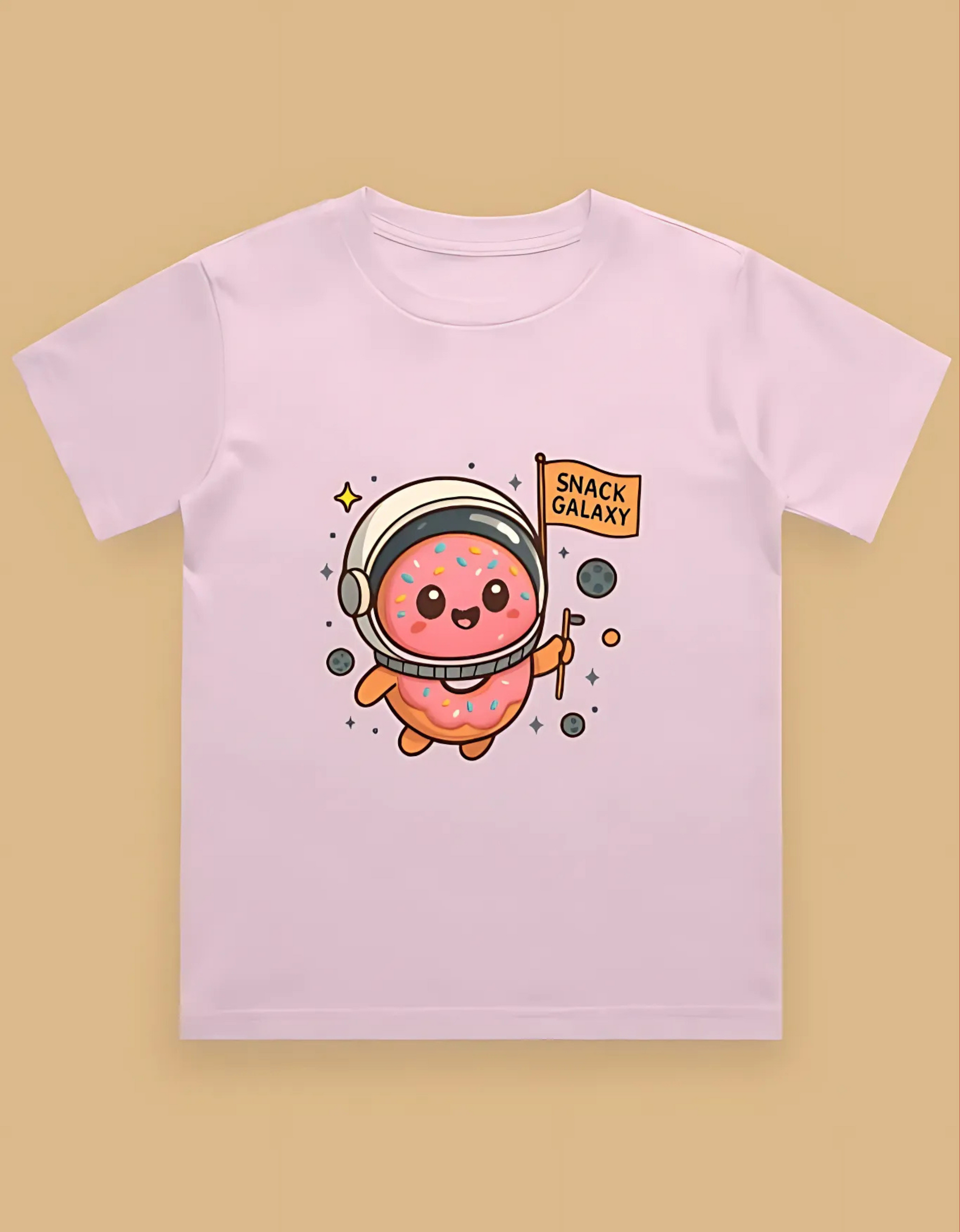 A cute pink donut in an astronaut helmet holding a "Snack Galaxy" flag – surrounded by stars and cookies. Perfect for kids who love quirky, space-themed fun!