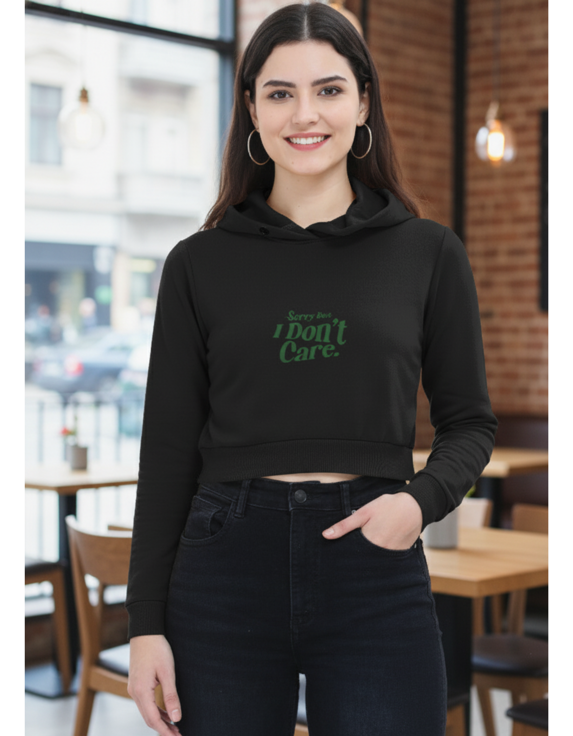 Make a bold statement with our stylish Women's Cropped Hoodie. This trendy piece, featuring the playful printed design ("Sorry but I don't care." is visible in the image), is the perfect addition to your casual wardrobe. The cropped length pairs effortlessly with high-waisted jeans, joggers, or skirts, making it ideal for everything from coffee runs to cozy nights out.