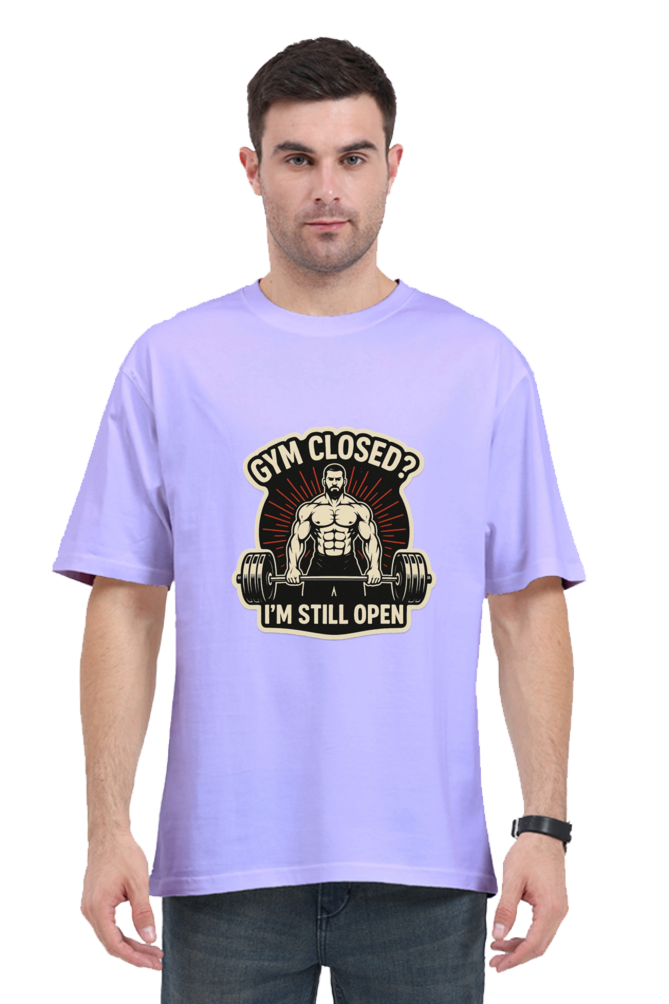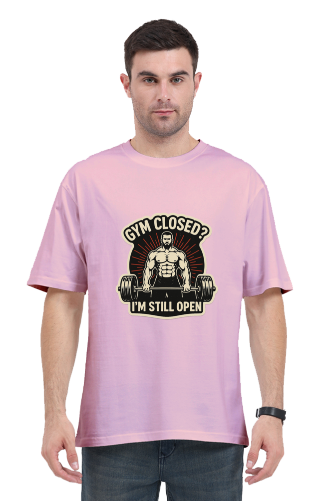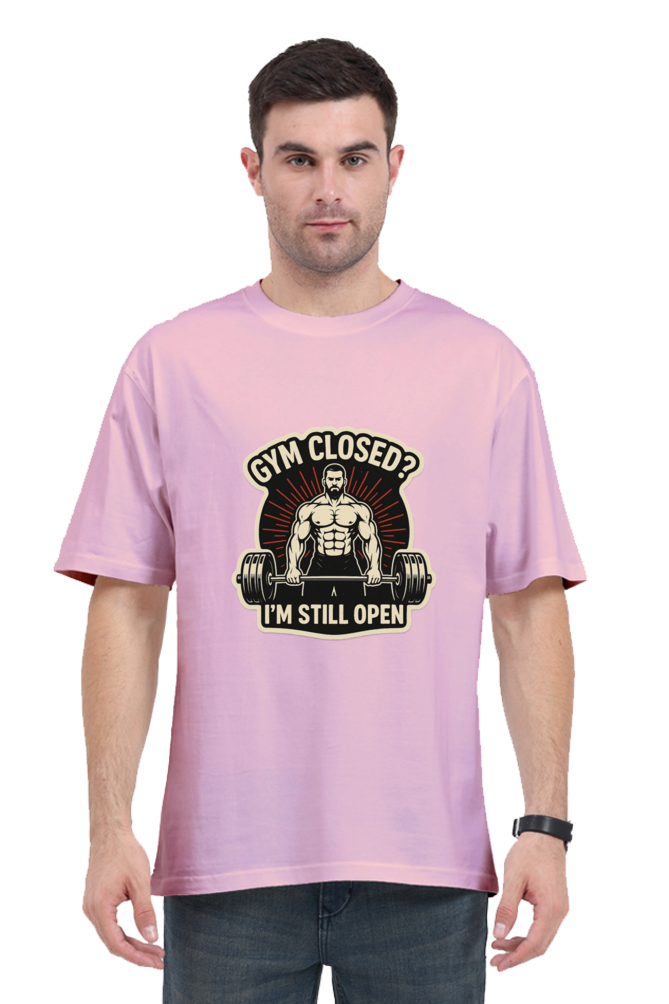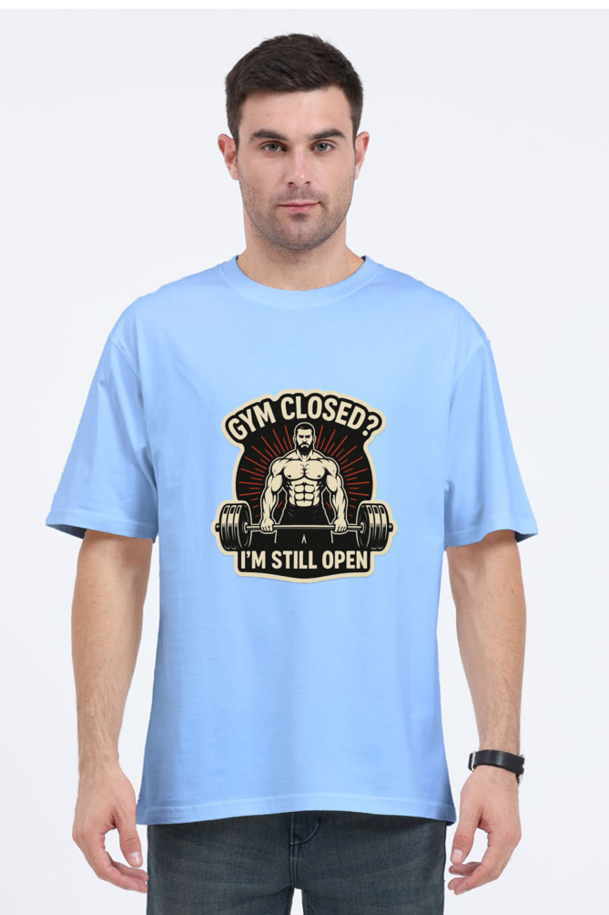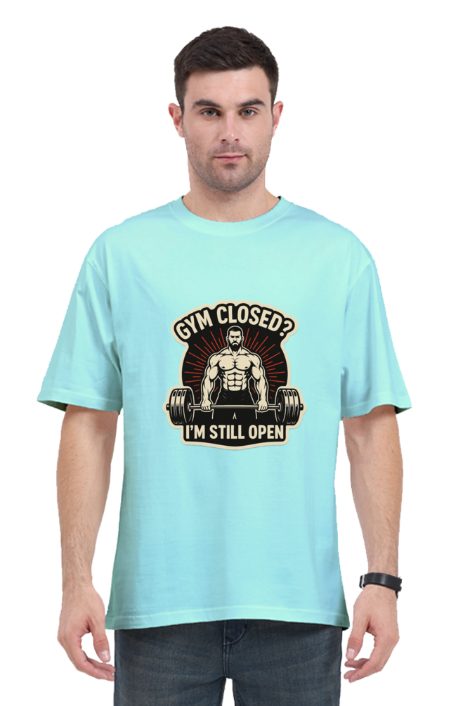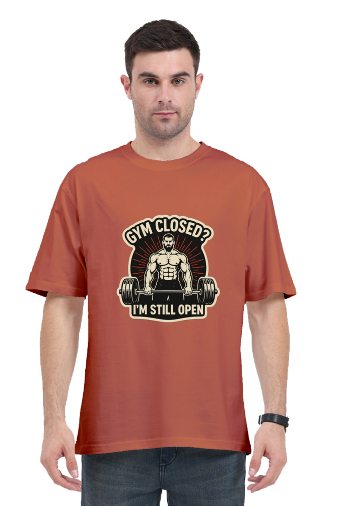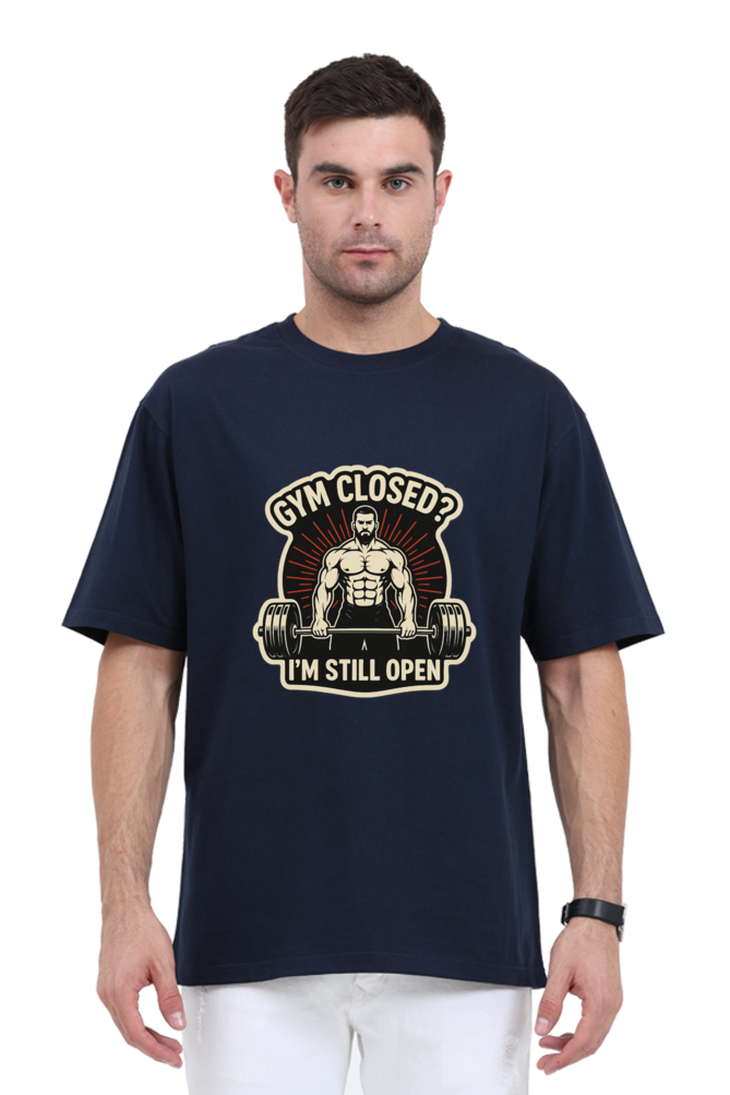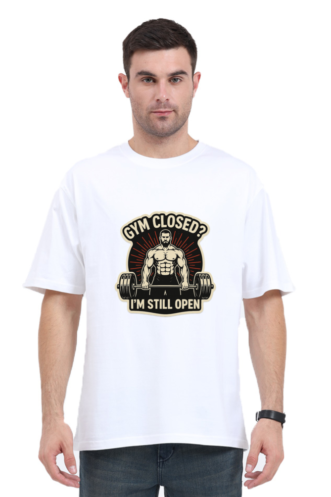 Gym Closed? I’m Still Open – Men’s Oversized T-Shirt | 240 GSM | 100% Cotton | Gym Motivation Print Tee | Bio-Washed & Pre-Shrunk