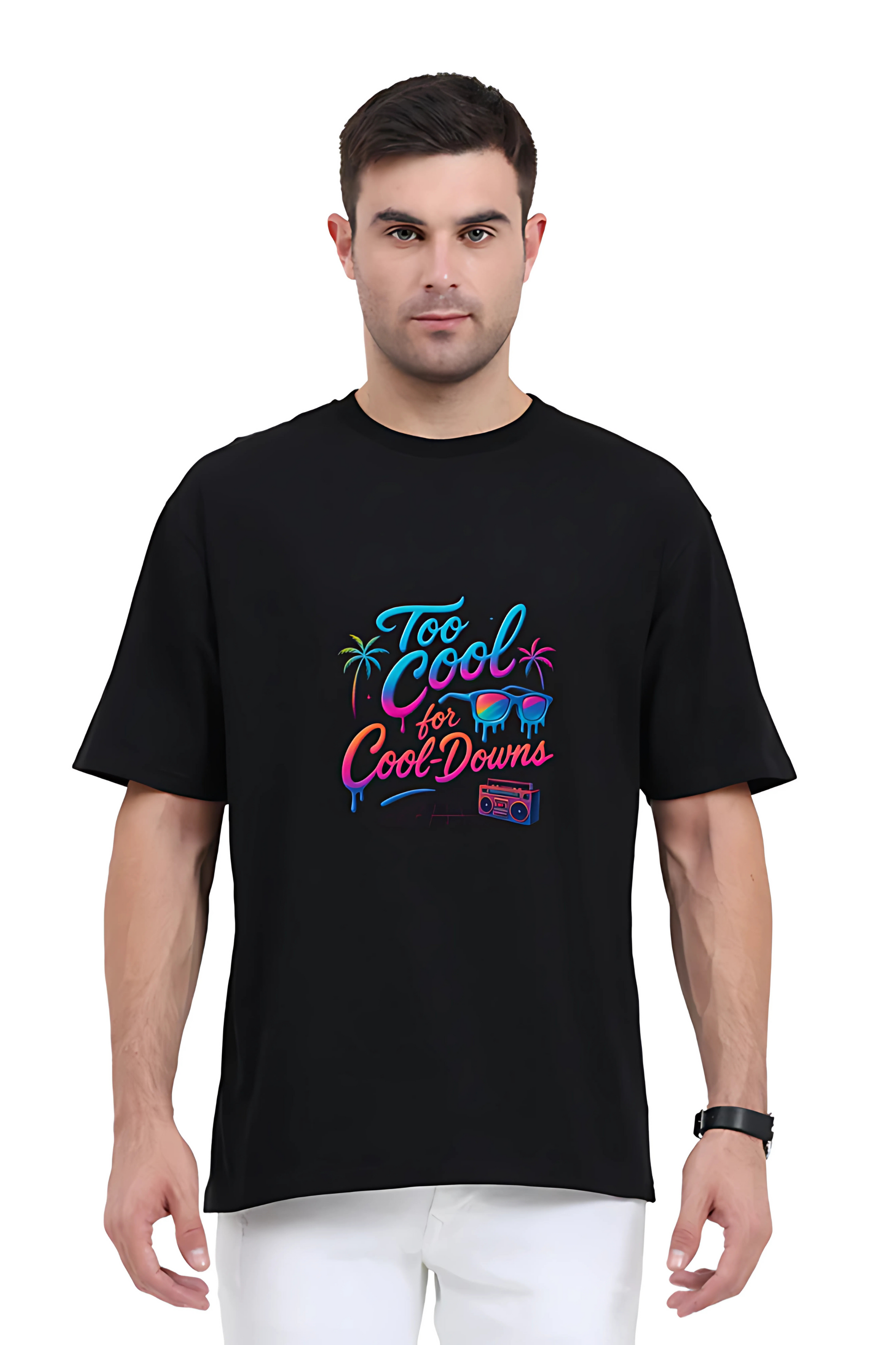 Channel pure retro energy with our "Too Cool for Cool-Downs" Oversized T-Shirt—a bold statement for those who bring heat to every scene and never back down. Featuring a neon-glow graphic with melting shades, palm trees, and an old-school boombox, this design is a blast from the past with futuristic vibes.