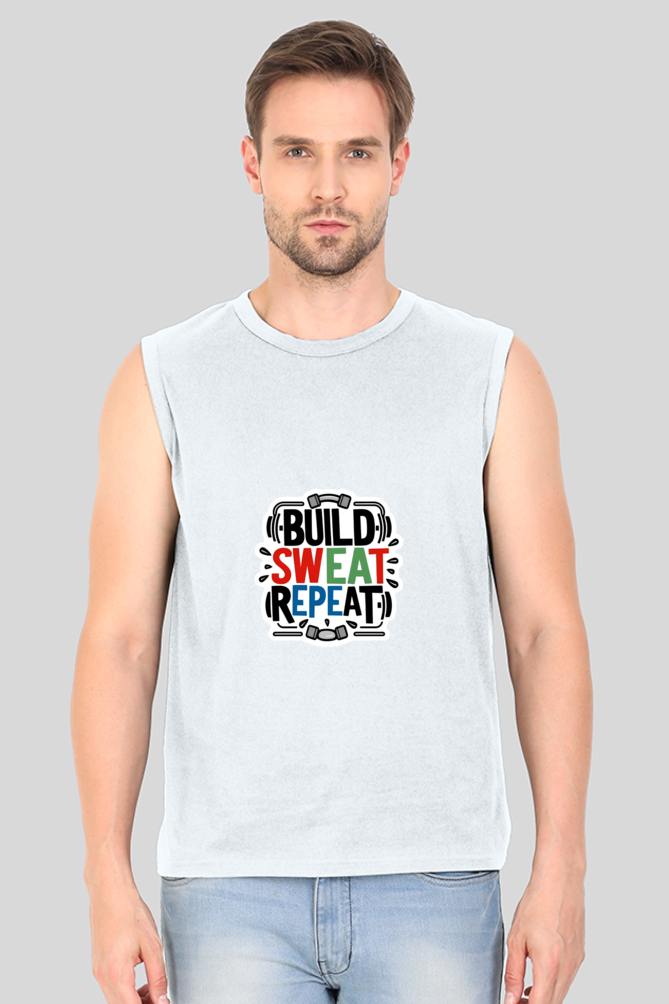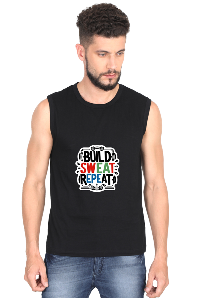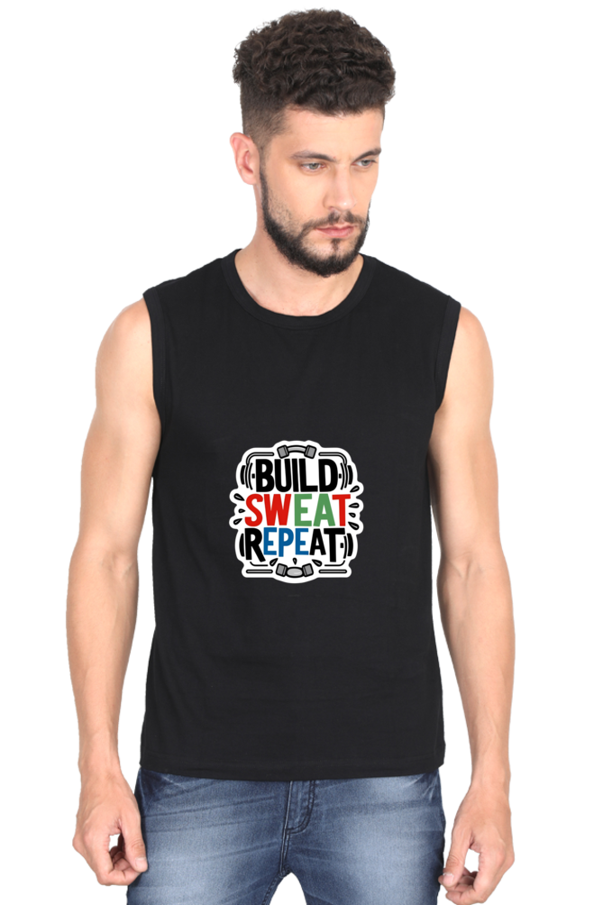 Men’s Sleeveless Gym T-Shirt – Build Sweat Repeat Print | 100% Cotton | 180 GSM | Regular Fit
