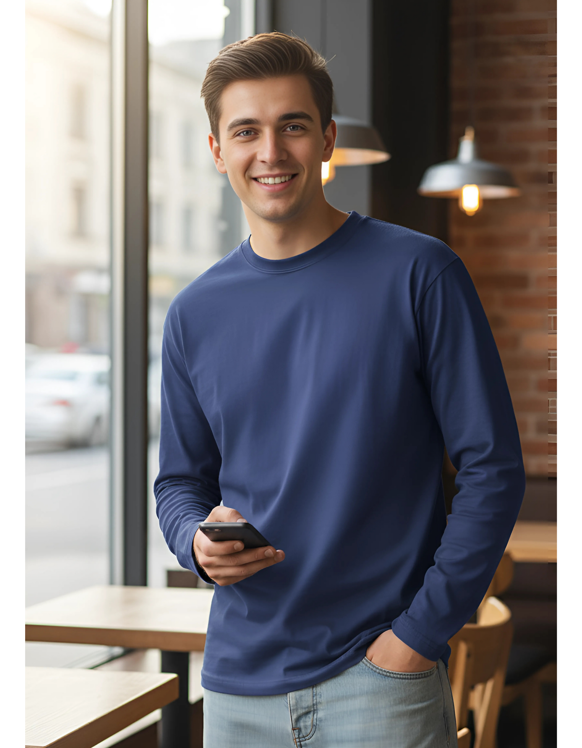 Men's Full Sleeve Plain Royal Blue T-Shirt | 100% Cotton | Bio Washed & Pre-Shrunk