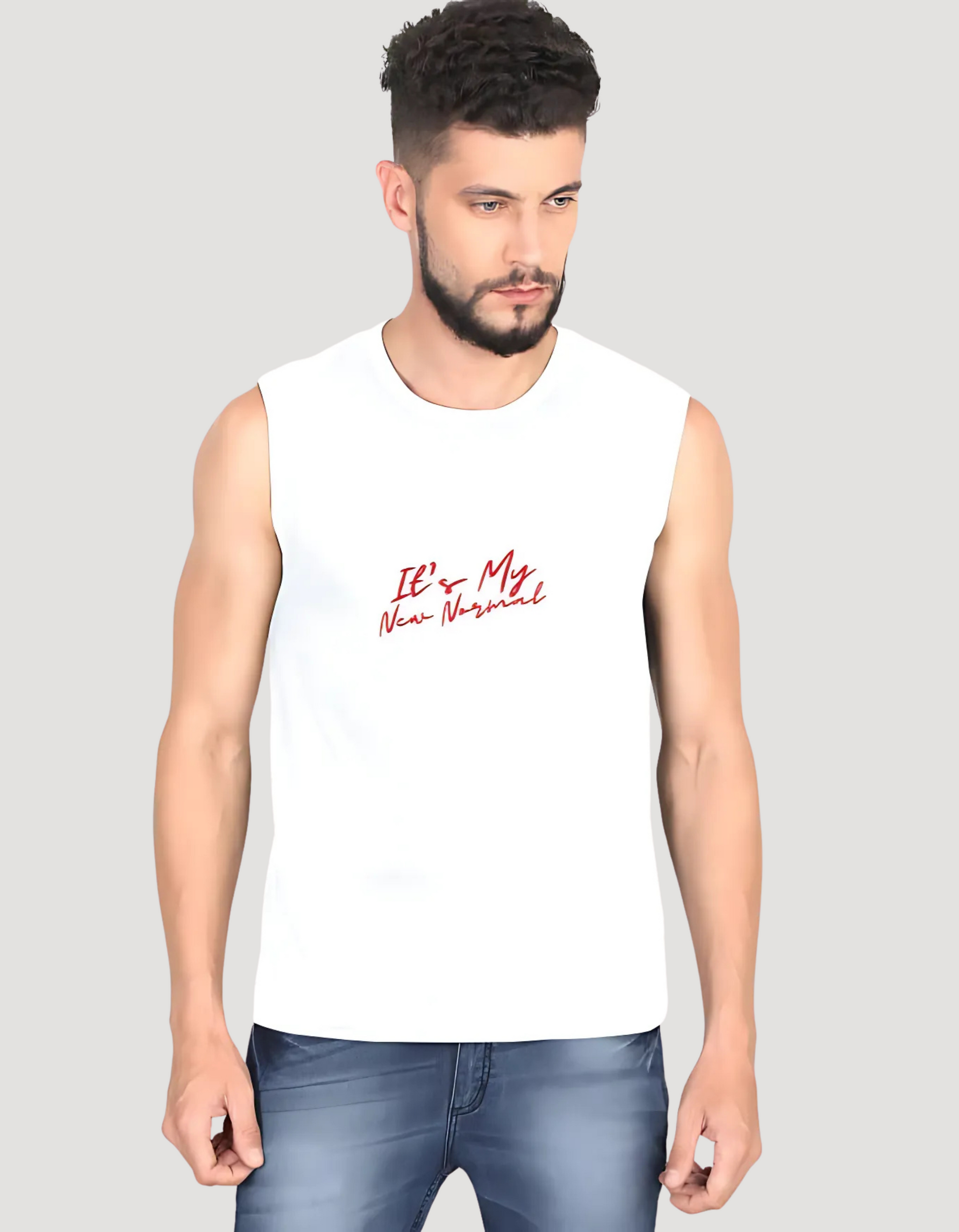 Men’s Sleeveless Cotton T-Shirt – "It’s My New Normal" Print | 180 GSM | Bio-Washed | Regular Fit