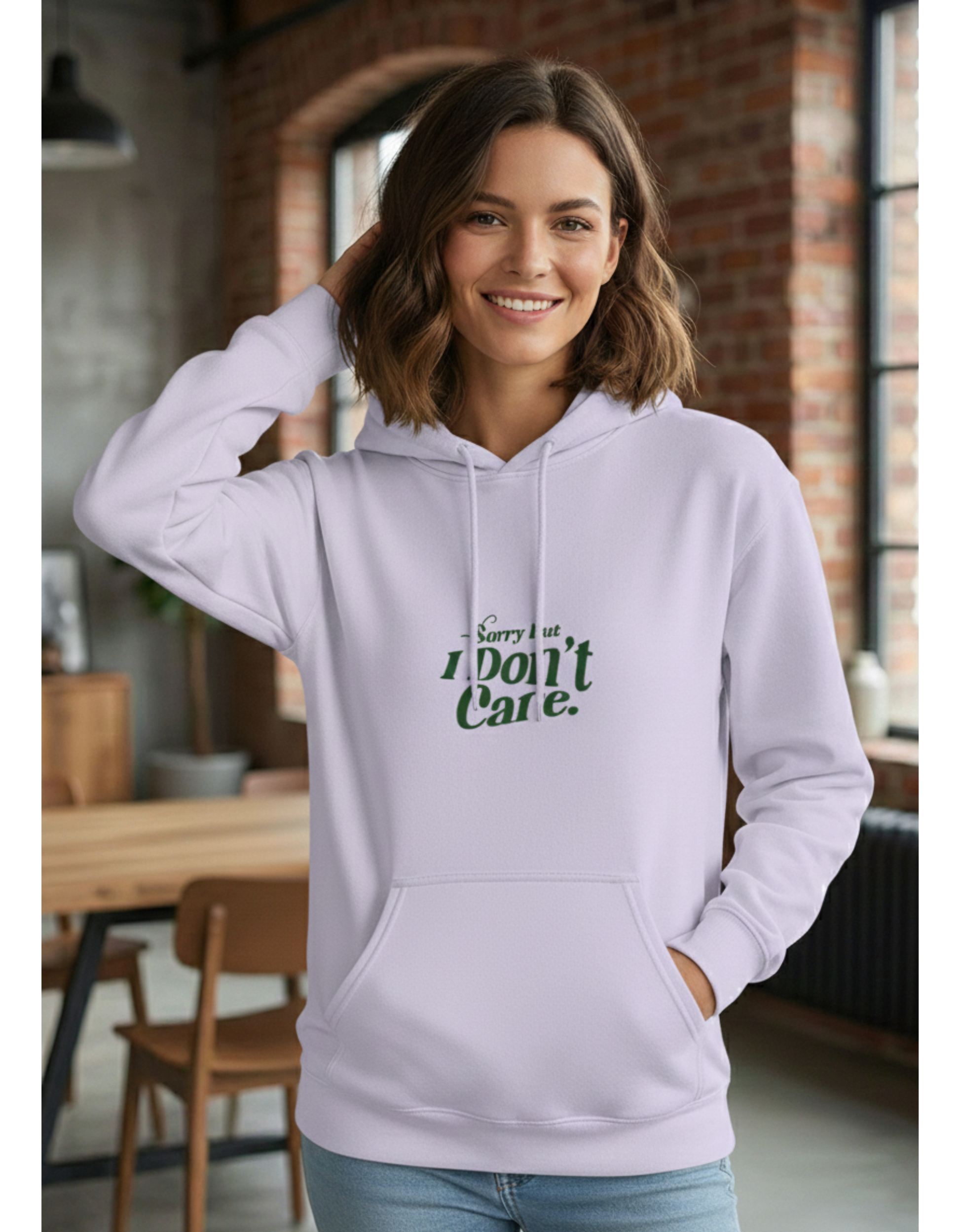 Express your unapologetic attitude with this comfortable and stylish graphic pullover hoodie. Featuring the bold, conversation-starting slogan, "Sorry But I Don't Care", this sweatshirt is the perfect blend of casual comfort and expressive personality. Whether you're running errands, lounging at home, or meeting up with friends, this hoodie is designed to be your go-to piece for effortless style. Available in multiple colors including classic White, sleek Black, soft Pink, and light Lavender (or similar based on your product files).