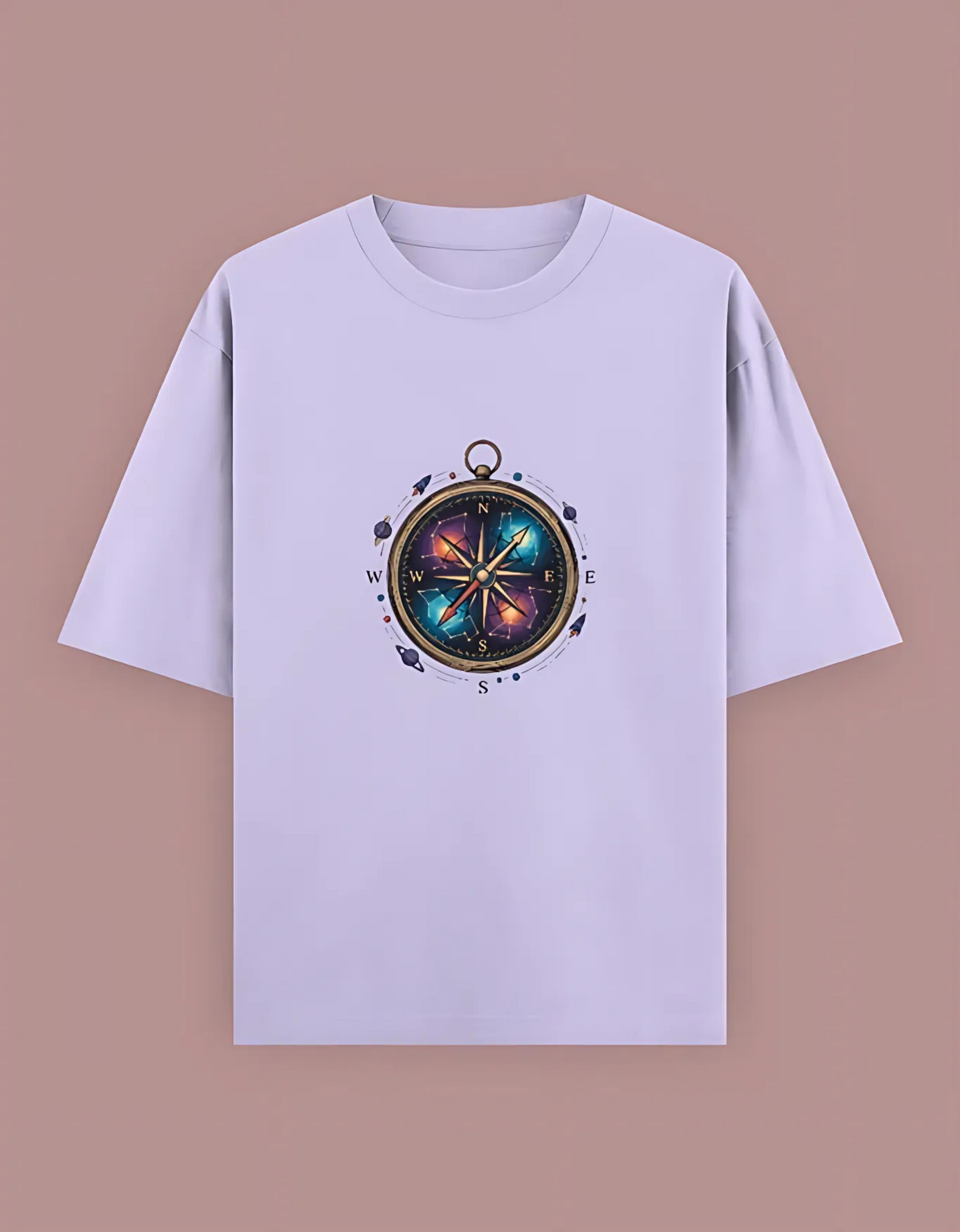 Navigate your style journey with this Unisex Oversized Classic T-Shirt, featuring a mesmerizing cosmic compass print surrounded by stars, constellations, and planets. Designed for bold expression and ultimate comfort, this tee is made from 100% super combed cotton with a solid 240 GSM thickness, delivering heavyweight durability and a premium hand feel.